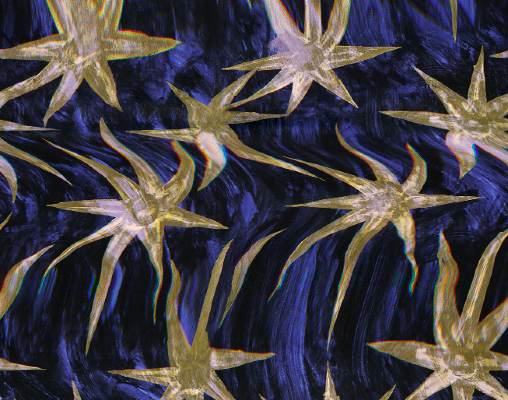 The second print, “Midnight in Su Riu”, is presented on crisp white cotton poplin. It portrays a series of shooting stars, revisiting memories of childhood nights in Sardinia. The stars are painted with 8 points, symbolising the fortune and luck associated with Su Componidori’s race. The artwork is distorted to evoke a surreal sense of movement that captures the enchantment of catching a shooting star.